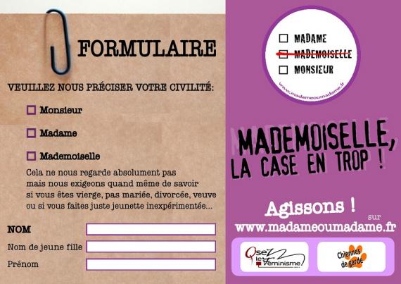 In Francia, a tutt’oggi, in atti pubblici o privati, più o meno ufficiali, viene chiesto loro di scegliere un titolo tra: Monsieur, Madame e Mademoiselle. Una catalogazione del genere femminile che va avanti dal Seicento, dall’epoca in cui il termine mademoiselle ha iniziato ad indicare una donna non sposata, con una chiara valenza sessista e discriminante, e al giorno d’oggi pure parecchio anacronistica. Due le associazioni che sono scese in campo per l’abolizione da parte dell’amministrazione francese dell’ormai desueto trittico, “Osez le féminisme” (Osate il femminismo) e “Chiennes de garde” (Cagne da guardia), che hanno dato vita, in forma congiunta, al sito madameoumadame.fr.