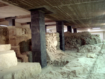 La struttura dell’edificio è costituita da un telaio rigido di travi e pilastri di calcestruzzo armato inglobati nella muratura. E’ stata definita come “struttura sospesa” perché non poggia direttamente sul sito archeologico ma sembra galleggiare su cuscinetti elastici, con la realizzazione di un giunto sismico perimetrale all’ edificio.