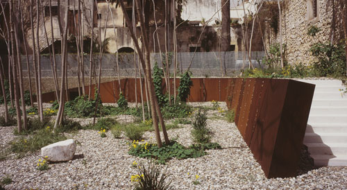 Solo al termine del percorso si scorge il giardino, la prima fase del progetto. Secondo un processo di vivificazione della memoria storica e dell’immaginario mitologico recupera le potenzialità di un’area fortemente stratificata. Tale stato ha suggerito di compiere un intimo intreccio fra l’artificio dell’intervento e la spontanea forza della natura.
