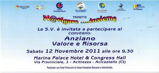 L’anziano può e deve avere un ruolo attivo nella società contemporanea : il progetto “Navigare Insieme” , con le sue diverse fasi di realizzazione , ha cercato di rendere “tecnologici” tutti i partecipanti. Infatti grazie a differenti ore di lezione tutti i fruitori del corso hanno imparato i precetti base dell’informatica e riescono ad utilizzare la gestione delle applicazioni e con una certà semplicità anche Internet. Le loro acquisizioni di tipo teleinformatiche , in uno step successivo, sono state messe a favore della comunità dei paesi di provenienza , grazie ad una catalogazione e archiviazione, in cartaceo e attraverso pc dei numeri utili per tutti gli abitanti, dalle associazioni di volontariato ai numeri di pubblica utilità , ai fini di realizzare uno sportello informativo, interamente gestito dagli anziani . La fase conclusiva si è avuta con un convegno : ” Anziano valore e Risorsa ” , presso il Marina Palace di Acitrezza , sabato 12 Novembre , dove si è parlato della contestualizzazione sociale del ruolo dell’anziano, dell’operato svolto e andato a buon fine del progetto e della propedeuticità in divenire sul da farsi e sullo sfatare il mito “dell’anziano palla al piede” .