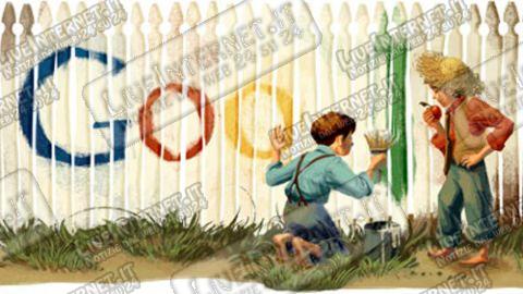 Il logo, alquanto vivace e colorato, riprende alcune illustrazioni ispirate a Le avventure di Tom Sawyer (1876), e in particolare l’episodio della staccionata: con furbizia Tom riesce a evitare la punizione della zia Polly facendo fare il lavoro all’amico Ben che imbianca, per l’occasione, anche il logo di Google.