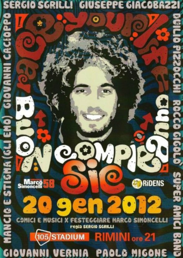 Per festeggiare quello che doveva essere il suo venticinquesimo compleanno, nel capoluogo romagnolo si prepara un vero e proprio evento in suo onore con affetto da parte di chi lo ha amato e lo continua ad amare, e con semplicità, così com’erano il suo spirito trasparente ed il suo sorriso scanzonato. La festa ha come location il 105 Stadium dove sarà Sergio Sgrilli con tanti comici e tanto divertimento a presidiare la serata proprio come lui l’ aveva programmata. Oltre alla comicità ed alla musica, però, non mancherà qualche momento che si preannuncia particolarmente toccante, con la proiezione dei video di Marco da bambino e nella vita quotidiana, con il papà che salirà sul palco per ricordarlo ancora una volta, alla presenza dei suoi amici di sempre e dei suoi colleghi piloti, su tutti Valentino Rossi ed Andrea Dovizioso. L’incasso della serata sarà devoluto alla Fondazione Simoncelli, una Onlus appositamente creata per ricordare Marco e far beneficienza in suo nome.