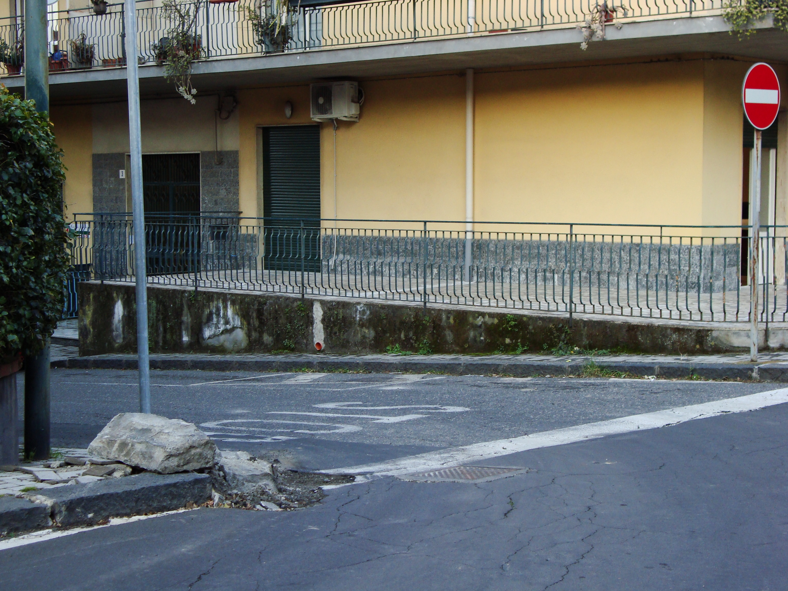 Infatti qualche giorno fa, un camion stretto tra la macchina in divieto ed il marciapiedi, dopo numerose manovre per cercare di evitare di sbattere con i due ostacoli, urta il marciapiedi frantumando i blocchi di pietra lavica di cui è composto.