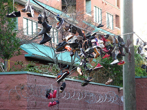 Varie sono le leggende metropolitane legate a questo singolare fenomeno: per alcuni appendere le scarpe ai fili serve a segnalare lo spaccio di droga; per altri è una pratica utilizzata dalle gang per commemorare un loro membro vittima di un omicidio o per segnalare i loro confini.