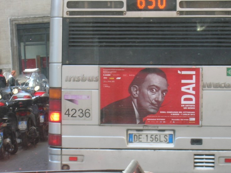 Anche gli autobus sembrano parlare pubblicizzando ad ogni passaggio questi eventi eccezionali. Lo sfondo rosso caldo da cui spicca il viso “impressionante” di Dalí ci attira nel mondo del genio creativo che trova casa momentanea al complesso del Vittoriano. “Dalí un artista un genio” nasce grazie alla voglia di far conoscere quali fossero i veri legami tra l’artista spagnolo e il nostro paese, relazioni quasi sconosciute fino a pochi anni fa e riportate alla luce dalla collaborazione con la Fundació Gala-Salvador Dalí. Un tunnel delle più spettacolari foto scattate al maestro dal russo-americano Philippe Halsman ed una successiva camera in cui dei filmanti accerchiano gli osservatori introducono alla “dimensione Dalí”, una realtà in cui egli stesso si cala nella parte di opera d’arte umana. Si avverte subito un desiderio dell’artista di riprendere, con le sue opere, gli esempi più classici del rinascimento, vera sua scuola di vita artistica, per introdurli in questo nuovo mondo cadenzato da invenzioni e scoperte stupefacenti come l’atomo ed i suoi componenti, o la bomba atomica intesa come potenza della scienza umana e non come arma di distruzione. Il fascino derivante da questi studi lo portò alla creazione di opere come la dematerializzazione vicino al naso di Nerone, eco geologica la pietà, grande testa di dio greco, eclipse et osmosi végetals, singolarità. Il quadro più antico della mostra, inoltre, è l’autoritratto con il collo di Raffaello del 1921. Più che impressionista il maestro si assesta nel realismo del mondo onirico con spietatezza ed inquietanti suggestioni. Lo stretto intreccio tra Dalì ed il bel paese è facilmente riscontrabile, nelle sue opere, dalle forti influenze suscitate in lui dalle visite al campo di Bomarzo dove i giardini abitati da mostri rocciosi che fuoriescono dal terreno lo atterriscono. Tra un viaggio a Catania e le ripetute visite a Roma e Venezia stringe forti relazioni con Luchino Visconti col quale collabora alla messa in scena di Rosalinda o Come vi piace di Shakespeare nel 1948. Questa lunga amicizia è testimoniata da un archivio di documenti ritrovato che apparteneva allo stesso Visconti. Ma i contatti col mondo italico non finiscono qui, famosi sono i rapporti di lavoro con la casa di produzione Alessi, vedi “oggetto inutile”; con la Rosso Antico per la quale realizza tre bottiglie. Ed ancora, costumi di scena, scenografie per il teatro La Fenice; interviste rilasciate a giornalisti italiani in cui spiega la sua ossessione per il rinoceronte ed in particolare il corno, visto dall’artista come unica forma in natura che segue una perfetta curva logaritmica. Agli amanti dei cartoons vengono mostrati i tre dipinti che il genio spagnolo produsse per il “progetto destino”, nato dall’unione di due delle menti più innovative del 900: la sua e quella di Walt Disney. A tal proposito, se provate ad affiancare i loro volti noterete la loro passione per i baffi. Al secondo piano è possibile sorprendersi con l’osservazione della Vespa della Piaggio, guidata da due studenti attraverso l’Europa, dipinta da Dalí e ribattezzata da lui medesimo dulcinea (amata da Cervantes). Un artista a tutto tondo, degno figlio del secolo in cui ha vissuto, in grado di distaccarsi dagli impressionisti, i quali lo rinnegarono non capendo fino in fondo la sua arte. Ma poco importa ad un artista che ha potuto prestare la sua arte ad un altro innovatore come Alfred Hitchcock in Spellbound. Invito tutti gli italiani a lasciarsi andare davanti tele del calibro di: la Madonna di port lligat, impressione d’Africa, autoritratto molle con pancetta fritta, le sentiment de vitesse, Gradiva retrouve les ruines antropomorphes, angelus architettonico di Millet, le spectre du sex-appeal, couple au tête plein de nuages, tavola in fronte al mare, bagnanti di Llaner, Tristan und Isolde, equilibrio intratomico di una piuma, il piede di Gala, alla ricerca della quarta dimensione e molti altri, il risultato sarà estremamente piacevole, trattandosi di un modo davvero impressionante di provare emozioni.