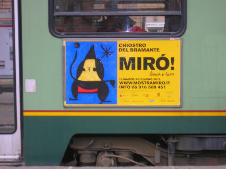 Se uscendo dal Vittoriano un bus vi transita davanti e notate una locandina che pubblicizza “Miró poesia e luce” non si tratta di una presa in giro o di un miraggio, basta passeggiare lentamente fino al chiostro del Bramante, nascosto dietro piazza Navona, proprio accanto la chiesa dalla sconvolgente perfezione di Santa Maria della Pace. Dopo il giro al chiostro e l’immancabile caffè potrete sprofondare tra le tipiche linee di Miró. I suoi colori sazieranno la vostra immaginazione, passando dal bianco e nero al giallo, al rosso, al blu marcati Miró. Un scorcio riprodotto in una sala espositiva vi farà vivere nel suo laboratorio di Maiorca, i video vi racconteranno la sua fissazione per il riutilizzo di materiali da dipingere e far rivivere. Alcuni bozzetti ricordano i suoi lavori per la decorazione di un salone dell’università di Harvard. Le donne, i paesaggi e gli uccelli, figure predilette dal maestro, sono impresse in grandi tele prive di titolo, le sculture e le statue decorate completano una vivace esposizione.