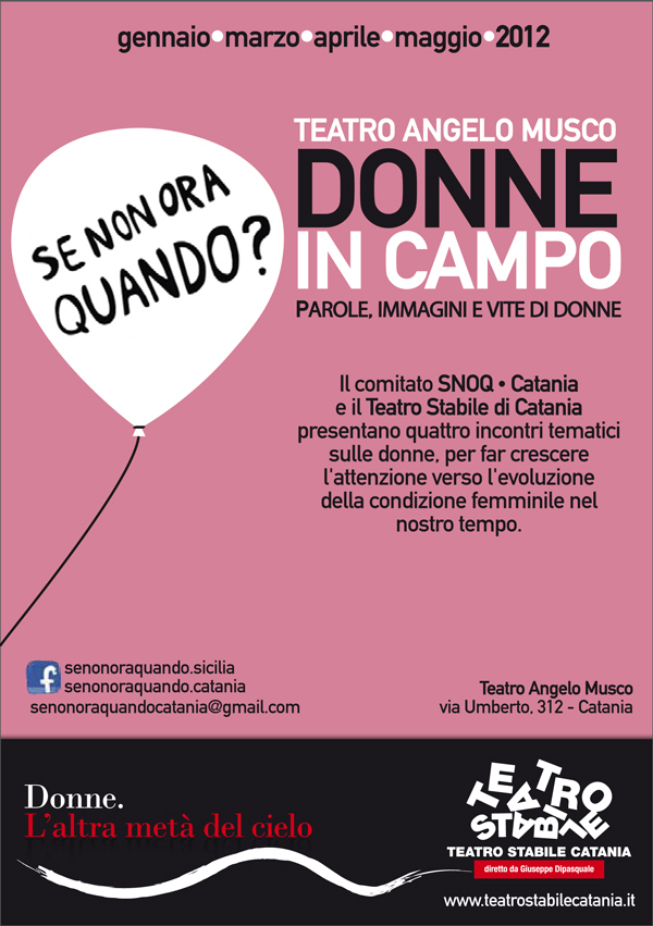La nostra testata giornalistica e la nostra radio si sono spesso occupate di forti tematiche riguardanti la figura della donna in tutti i suoi aspetti. La nostra partecipazione all’incontro “Donne in campo. Parole, immagini, vite di donne” promosso dal teatro stabile di Catania e da Snoq Catania, comitato provinciale dell’associazione “Se non ora quando”, per la tutela della donna, dei suoi diritti e della sua dignità, che si incastonano perfettamente con la tematica abbracciata dallo Stabile di Catania per la stagione 2011-2012 “Donne, l’altra metà del cielo”, ci permette di proseguire nel difficoltoso tentativo di risveglio totale delle coscienze.