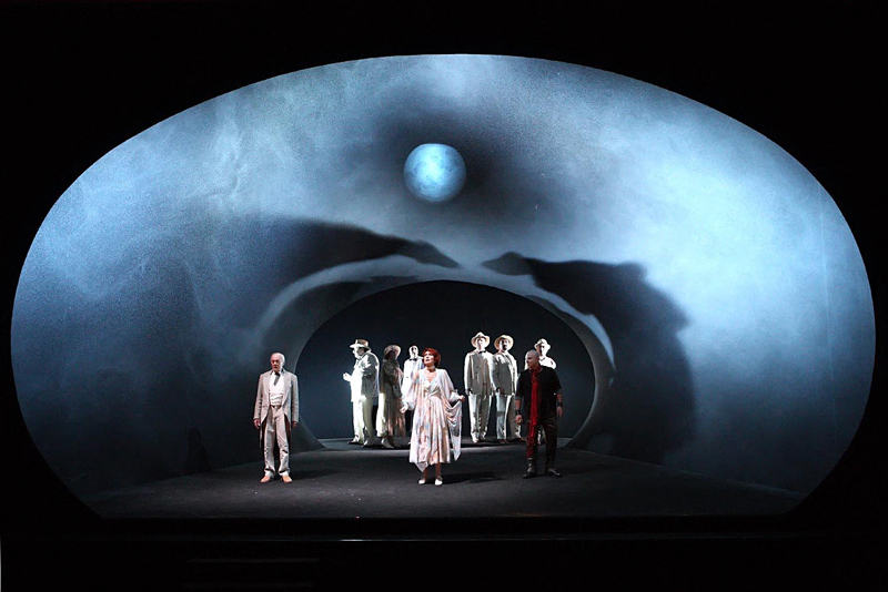 Come non fare un grande complimento al creatore delle scene, Antonio Fiorentino e a quello delle luci, Franco Buzzanca!? Il primo effetto scenico che sembra colpire il pubblico è quello di un occhio visto dall’interno in cui tutti gli attori si muovono, o di un tunnel con in fondo una luce. Si ha la sensazione di cadere in uno spazio onirico ma prospettico, come in una insolita caverna cerebrale, da associare, magari, alla mente del drammaturgo. È un’ambientazione a membrana, ideale per diffondere la musica, e dove far scorrere la luna nel suo movimento ascensionale mentre scandisce, come le lancette di un orologio, il fluire degli eventi.