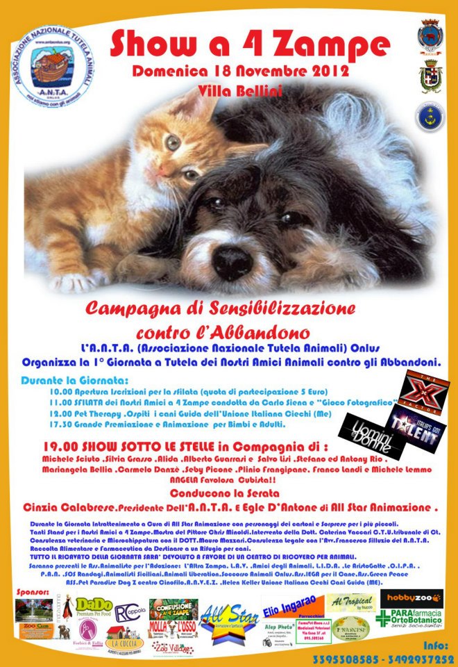 Lo scorso mercoledì 14 novembre alle ore 11 presso la ‘sala coppola’ del Comune di Catania si è svolta la conferenza stampa di presentazione della prima edizione di << Show a quattro zampe >> manifestazione di sensibilizzazione contro l’abbandono degli animali che si terrà domenica 18 novembre alla Villa Bellini di Catania. L’iniziativa è organizzata dall’ Associazione nazionale per la tutela degli animali ‘A.n.t.a. Onlus’ in collaborazione con ‘All star Animazione’ e con il patrocinio del Comune di Catania, della Provincia regionale di Catania e dell’ Autorità portuale. L’evento vedrà anche la partecipazione di personaggi del mondo dello spettacolo. L’intero ricavato sarà infine devoluto in beneficienza. Alla conferenza stampa sono intervenuti: la dott. Cinzia Calabrese presidente ‘Anta Onlus’, il dott. Manfredi Zammataro consigliere comunale di Catania, il dott. Enzo D’Agata consigliere provinciale di Catania, il dott. Mauro Mazzari medico veterinario e responsabile ‘Associazione soccorso animali Onlus’, Lucilla Fiore presidente ‘Pan’, la Dott. Cristina Zerbo responsabile dell’Associazione ‘pet paradise dog z’ centro cinofilo. Inoltre componenti del gruppo di animazione ‘All Star animazione’ e i soci delle associazioni aderenti.
