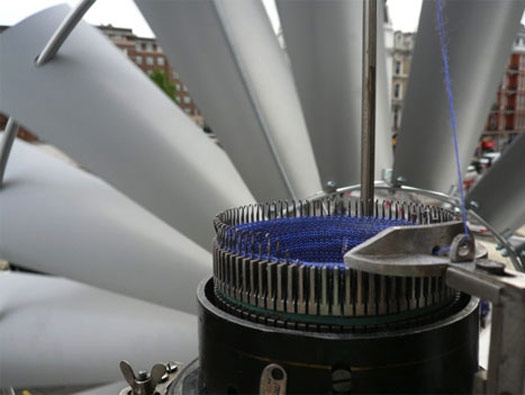 L’unicità del prodotto questa volta non dipende dalle mani del sarto più esperto o dalle mani più delicate o dal filato più pregiato bensì dal volere del vento. I  mulini a vento hanno dato lo spunto ad una designer olandese, Merel Karhof, per l’invenzione installata e funzionante già sul balcone del suo laboratorio londinese costituita da una pala eolica che alimenta un telaio per maglieria. La Karhof stabilitasi in passato per qualche anno in Italia ha chiamato questo suo “assemblaggio” Wind Knitting Factory, la macchina per maglieria alimentata esclusivamente dal vento. Una sorta di tre piedi sorregge le pale eoliche formanti un diametro complessivo di circa un metro, il vento apporta energia all’elemento rotante e, attraverso la trasmissione, al sistema del telaio per maglia non di grandi dimensioni. È il vento che decide quando produrre e mettere in funzione la fabbrica di sciarpe collocata all’interno ed è lo stesso vento che imprime velocità ai ferri della macchina a velocità non costante. La particolarità ulteriore è che la sciarpa così prodotta viene fatta discendere dal balcone fungendo in tal modo da indicatore della quantità di vento presente in città. Successivamente il tessuto pendente viene raccolto e tagliato in singole sciarpe che vengono ulteriormente lavorate al piano inferiore. L’unicità di ogni singolo pezzo è riscontrabile nell’etichetta in cui è possibile leggere la data e l’ora della lavorazione, il tempo impiegato alla produzione ed, infine, la quantità di vento sfruttata. La lunghezza di ogni sciarpa non supera i due metri mentre le lane impiegate e i colori variano di continuo per diversificare la produzione come è normale che sia.
