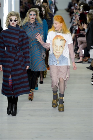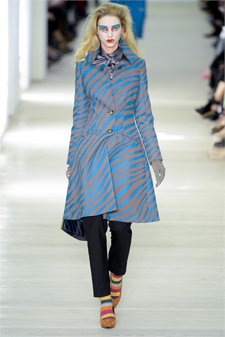 Predominanza di gradazioni cerulee, righe asimmetriche e trucco forte per la donna vestita in Red Label da Vivienne Westwood.