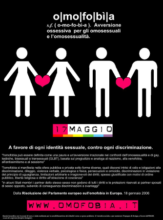 Ieri si è, per l’appunto, celebrata la giornata internazionale contro l’omofobia e la transfobia, indetta dal 2007 dall’Unione Europea, per celebrare la rimozione da parte dell’Organizzazione mondiale della sanità (avvenuta nel 1990) dell’omosessualità dalla lista delle patologie mentali.