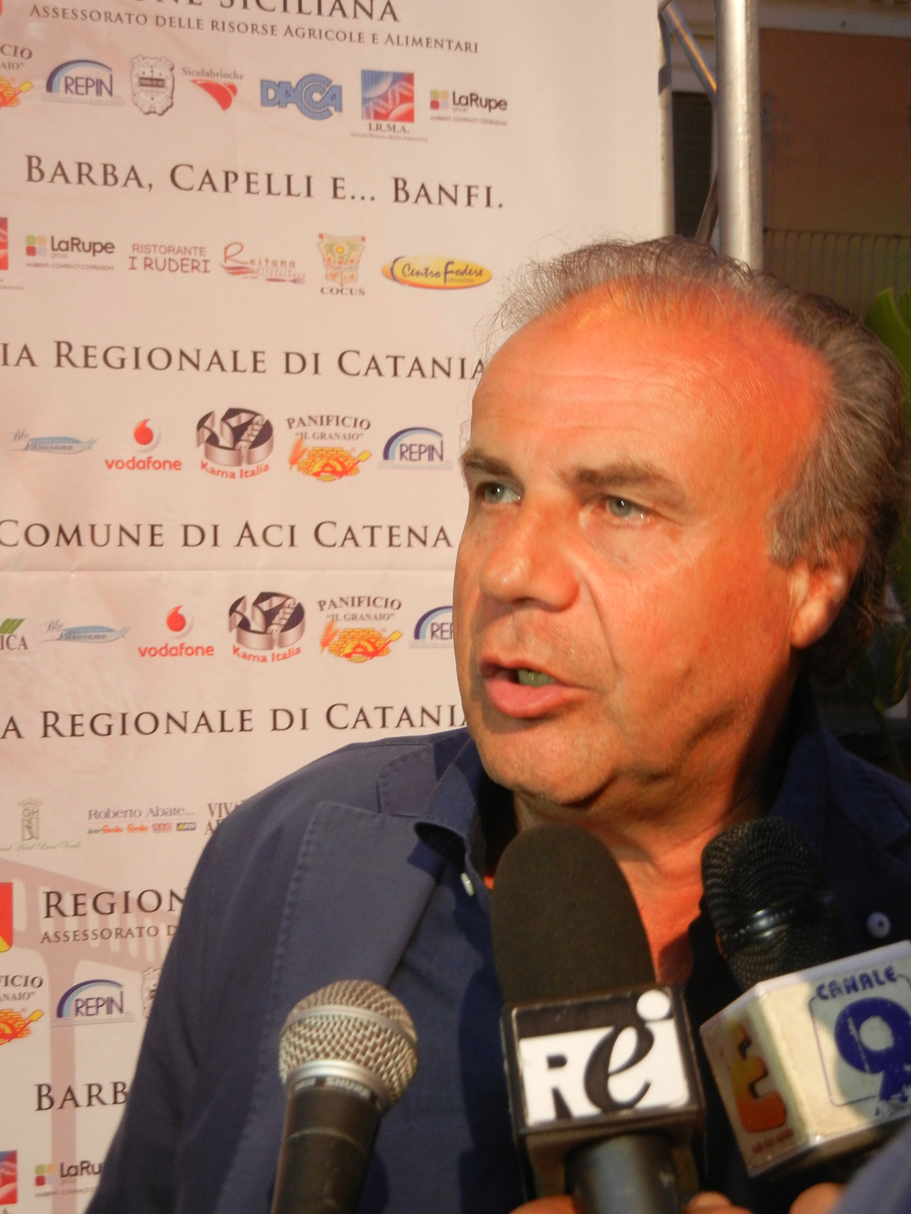 Fresca atmosfera estiva a Piano Umberto, la Piazza è gremita e si attende con curiosità e trepidazione l’arrivo di Lino Banfi e Jerry Calà. Il mormorio della Piazza si fa sempre più insistente quando le due celebrità arrivano ed illuminati dai flash si dedicano a rispondere alle domande della Stampa: con i nostri microfoni riusciamo ad intervistare i due attori, protagonisti del celebre film “Al Bar dello Sport”.