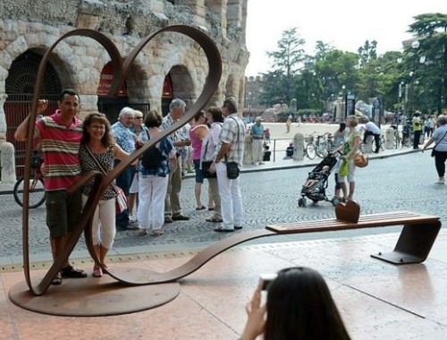 E’ stata installata tra piazza Bra e l’imbocco con via Mazzini, di fronte l’Arena, la panchina dedicata ai personaggi shakespeariani inaugurata il 6 settembre. Pensata e donata alla città da due artisti dell’Atelier Studio Borella di Manzano (in provincia di Udine), su commissione del sindaco Tosi, la panchina-scultura è realizzata in acciaio corten trattato a cera e legno, con un grande cuore formato dalle lettere «G» ed «R», ovvero le iniziali di Giulietta e Romeo, larga quattro metri e alta 2,30, con divisorio “antibivacco” sulla seduta a forma di cuore.