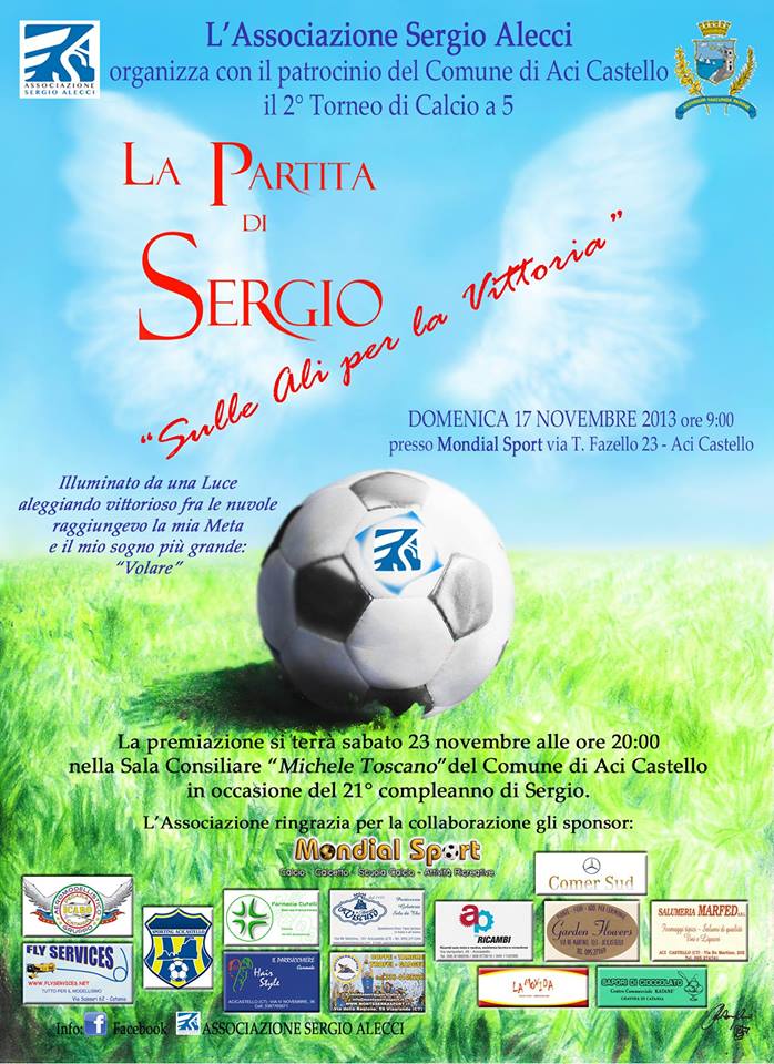 Domenica prossima, 17 novembre 2013 alla ore 9,00 nell’impianto sportivo “Mondial Sport” di Aci Castello (via T.Fazello) si terrà il 2° Torneo di calcio a 5 denominato “La Partita di Sergio – Sulle ali per la Vittoria”, evento organizzato dall’Associazione Sergio Alecci con il patrocinio del Comune di Aci Castello per ricordare il giovane tragicamente scomparso. Nel contesto della manifestazione sportiva, l’Associazione illustrerà i propri fini benefici. Successivamente, sabato 23 novembre 2013 (in occasione del 21° compleanno del compianto Sergio) alle ore 20,00 nella Sala Consiliare “Michele Toscano” del Municipio di Aci Castello, si terrà la premiazione dell’evento sportivo.