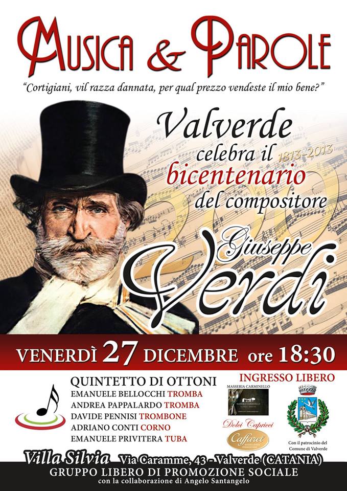 In occasione del bicentenario dalla nascita del compositore Giuseppe Verdi il gruppo Libero di Promozione Sociale con la partecipazione di Angelo Santangelo e con il patrocinio del comune di Valverde, hanno organizzato l’evento “Musiche e Parole”.