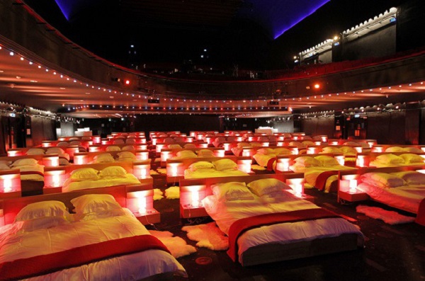 Ancora una volta è stata la patria del cinema a dare l’input: a Parigi il cinema teatro Olympia, per promuovere una linea di arredamento svedese, ha riorganizzato una delle sue sale sostituendo alle classiche poltrone una serie di comodi letti a due piazze. Una fortuita idea, dovendosi trattare di un caso isolato, che ha invece subito conquistato Inghilterra, Malesia, Thailandia, Indonesia e Giappone divenendo una realtà consolidata.