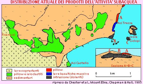 Secondo le fonti tratte da uniroma3.it/gnv/etna si può leggere: “Le prime eruzioni dell’Etna sono state colate di lava emesse all’interno di un bacino marino poco profondo. Non è possibile ricostruire le dimensioni del bacino e delle colate, in quanto quasi tutto è stato riempito e cancellato dall’attività successiva. Solo lungo la costa a Nord di Catania, nei centri di Aci Trezza e Aci Castello e un paio di km verso l’interno nei pressi di Ficarazzi sono visibili i prodotti di questa prima attività etnea.