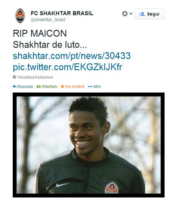 Lutto nel mondo del calcio: tweet in onore di un giocatore brasiliano “Maicon” che giocava in Ucraina, “Shakhtar Donetsk”, scomparso oggi in un incidente stradale.