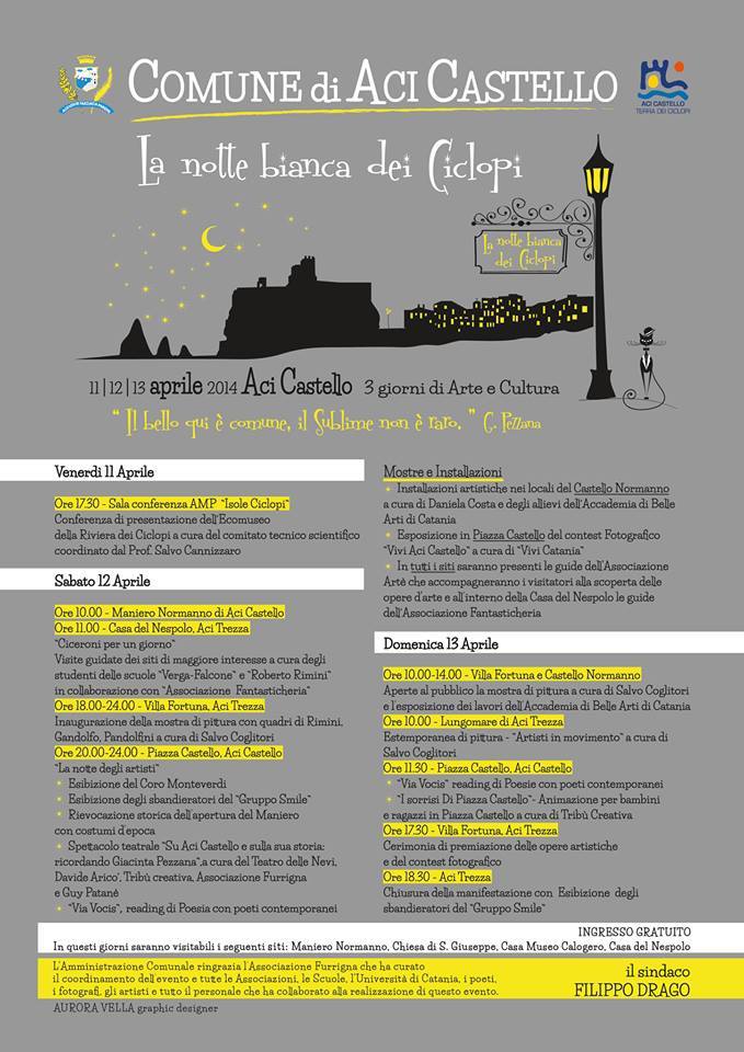 Venerdì prossimo, 4 aprile 2014 alla ore 10,30 nel Municipio castellese, si terrà la conferenza stampa di presentazione della Notte bianca dei Ciclopi in programma il prossimo 12 aprile ad Aci Castello. La manifestazione si inserisce nel contesto di un fine settimana ricco di avvenimenti ed aperto dalla conferenza di presentazione dell’Ecomuseo della Riviera dei Ciclopi in programma venerdì 11 aprile 2014 alle ore 17,30 nella sala conferenze dell’Area Marina Protetta “Isole Ciclopi” di Acitrezza. Il giorno dopo, sabato 12 aprile, il programma prevede visite guidate nel Maniero Normanno di Aci Castello e nella Casa del Nespolo di Acitrezza mentre dal pomeriggio a tarda ora e nella giornata di domenica 13 aprile ci sarà spazio per mostre di pittura, l’esibizione del Coro Monteverdi e degli Sbandieratori del Gruppo Smile, la rievocazione storica dell’apertura del Maniero con costumi d’epoca, reading di poesia con poeti contemporanei, installazioni artistiche, esposizioni fotografiche etc. Possibile, inoltre, visitare anche la Chiesa di San Giuseppe e la Casa Museo Calogero. La suggestiva kermesse, voluta dall’Amministrazione Comunale guidata dal Sindaco, Filippo Drago, è stata resa possibile dalla fattiva collaborazione delle Associazioni presenti sul territorio, dagli Istituti Scolastici e dall’Università di Catania, oltre naturalmente a tutti gli artisti, poeti, fotografi e personale in genere che hanno lavorato in un’unica direzione per la perfetta riuscita dell’evento.