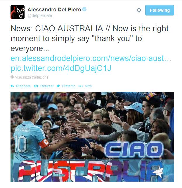 Dopo due stagioni, segnando 24 gol, Alessandro Del Piero ha deciso di concludere la sua carriera in Australia con il Sydney FC.