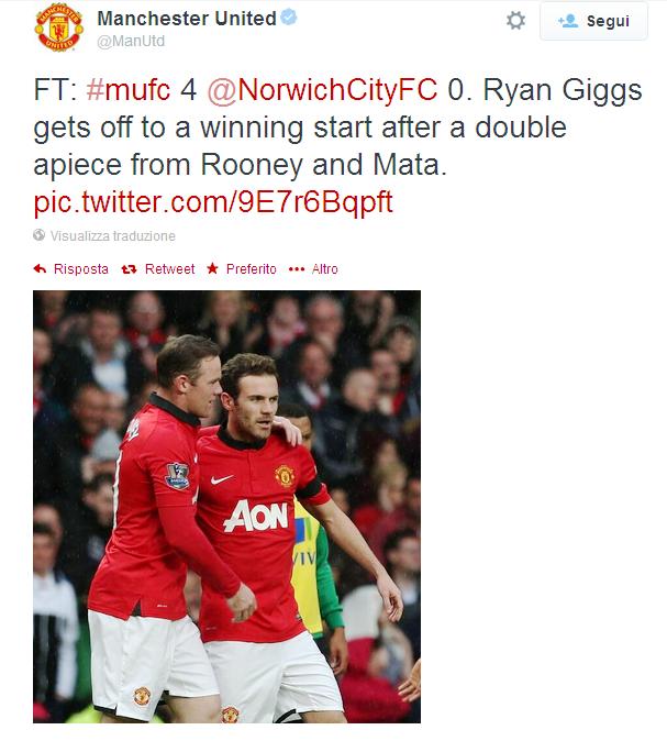Buona la prima per Ryan Giggs, batte il Norwich per 4-0, con le doppiette di Rooney e Mata.