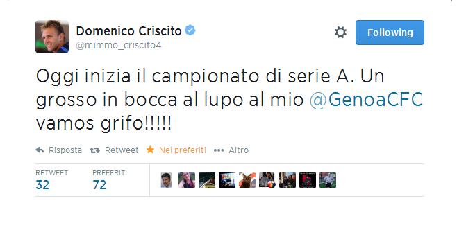 Dalla fredda Russia, Domenico Criscito, difensore dello Zenit San Pietroburgo, manda i migliori auguri alla sua ex squadra, il Genoa, dove ha militato per molti anni.