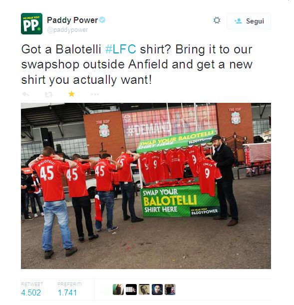 Visto la delusione dei tifosi del Liverpool per Balotelli, l’agenzia di scommesse irlandese Paddy Power ha proposto ai tifosi, prima della partita contro l’Hull City di scambiare la maglia di Balotelli con quella dei bomber storici del club