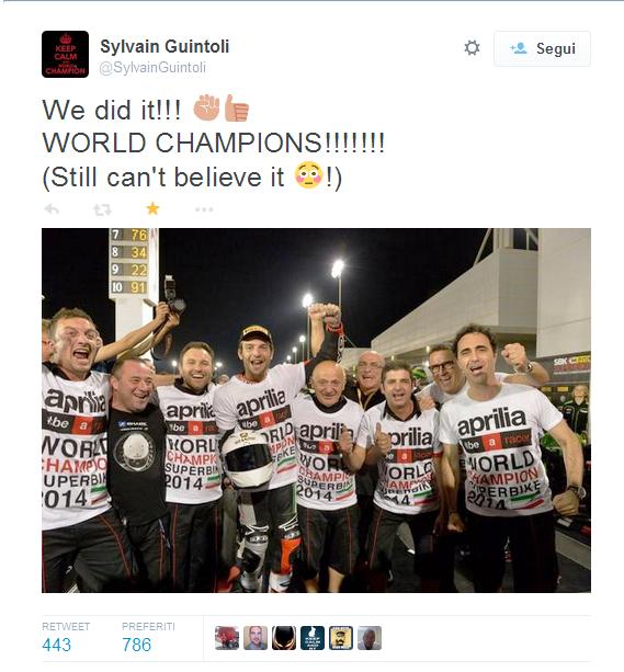 Un anno da non dimenticare per l’Aprilia, nell’ultima gara del Mondiale di Superbike, disputata in Qatar, arriva la doppietta del francese Sylavain Guintoli, che permette alla casa italiana, di conquistare il titolo piloti e il titolo costruttori di Superbike 2014. Inoltre questo si tratta del terzo anno consecutivo che l’Aprilia conquista il titolo di Campione del Mondo Costruttori. Per l’azienda motociclistica italiana questo titolo si tratta del 54° titolo conquistato nella sua storia.