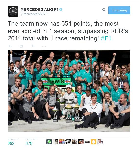Continua la sfida in casa Mercedes, nel GP del Brasile "San Paolo" Rosberg trionfa su Hamilton, riducendo il suo svantaggio a 17 punti, adesso il titolo si deciderà ad Abu Dhabi, con il punteggio raddoppiato. "vale solo nell'ultimo GP" Con la doppietta del GP del Brasile, la Mercedes arriva a 651 punti nella classifica costruttori, superando il record della Red Bull nel 2011, che si fermò a 650 punti, ma la Mercedes può ancora aumentare il distacco con l'ultimo GP che si disputerà ad Abu Dhabi.