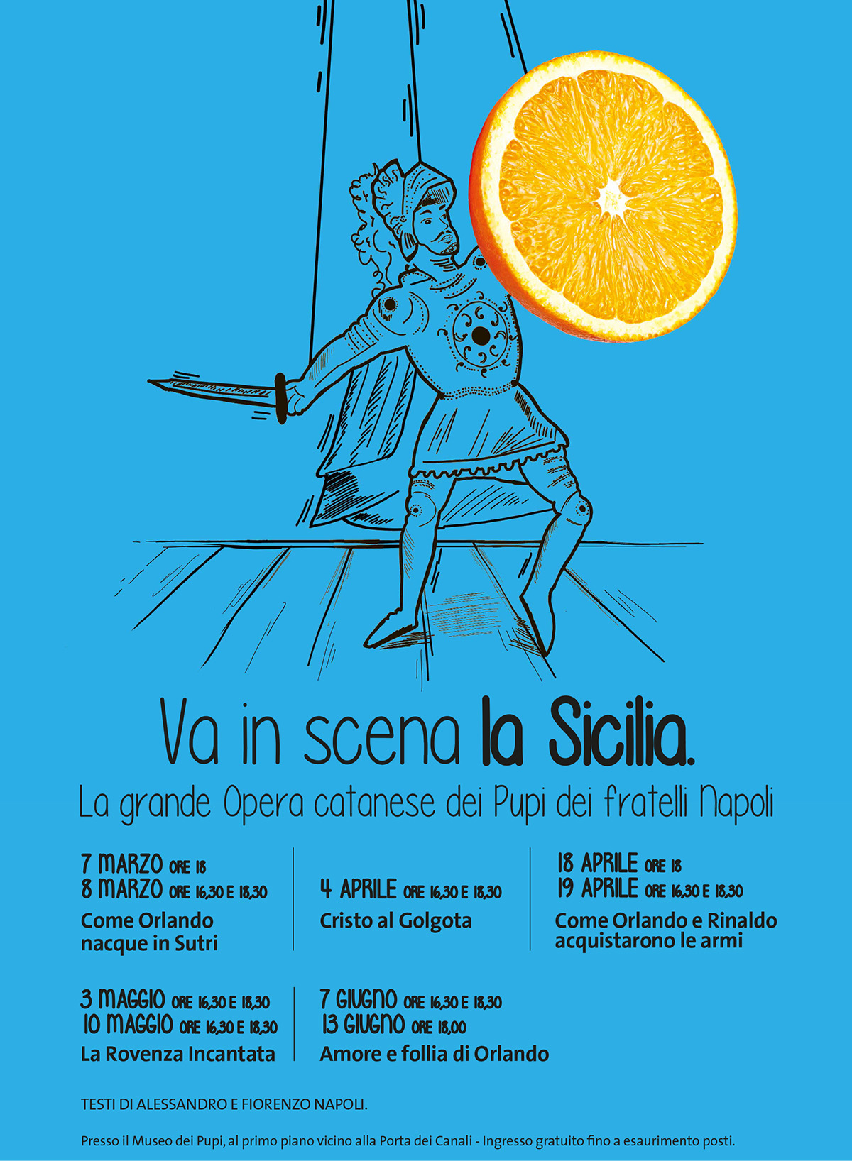 Orlando, Rinaldo e l’amata Angelica trovano il palcoscenico adatto per riemergere dall’ombra. Grazie al direttore del centro commerciale “Le Porte” di Catania, Simone Rao, la grande opera catanese dei Pupi dei fratelli Napoli ritorna in scena. L’obiettivo è quello di non perdere una tradizione importate per la Sicilia. Arte e cultura si uniscono in un vortice di emozioni, una storia nata un secolo fa che ha portato l’Unesco a dichiarare, nel 2001, i Pupi Patrimonio Immateriale dell’Umanità. Il fascino delle narrazioni cavalleresche ci intriga e ci trasporta nell’epoca carolingia dove i Pupi Siciliani prendono vita. Nel 1921 nacque la compagnia marionettistica dei Fratelli Napoli con Gaetano Napoli ed oggi giunge alla quarta generazione con Fiorenzo Napoli. La famiglia si è sempre mantenuta alle tradizioni della messinscena ma è riuscita nonostante ciò ad adattarsi ad un pubblico che si evolveva nel tempo. Dopo la metà del ‘900 la famiglia Napoli dovette confrontarsi con un cambiamento delle abitudini popolari, la gente iniziava a non andare più al teatro in modo ciclico. Per far fronte a questo problema nel 1973 Natale Napoli inventò i “pupi piccoli” di 80 cm, quelli che siamo abituati a vedere agli spettacoli, che consentirono di portare lo spettacolo al di fuori dei teatri, nelle scuole per esempio o nelle sale parrocchiali ed in quelle dei circoli culturali. Un altro grande cambiamento, che attuarono per affrontare lo stesso problema, fu quello di mettere in scena delle storie che avessero un inizio ed una fine all’interno di un unico spettacolo, mentre prima invece la storia si prolungava per diversi giorni. Questi due cambiamenti hanno reso l’opera dei pupi alla portata di tutti e ben visibile da più gente di quanto lo fosse prima.