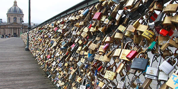 Le origini della moda dei lucchetti degli innamorati in Europa ha origini lontane nel tempo: avrebbe avuto inizio grazie a un racconto di guerra serbo degli anni della Prima Guerra Mondiale: si racconta di una maestra innamorata di un soldato il quale, partito per il fronte, sposò una donna greca senza far mai più ritorno; la maestra morì per il dolore e i suoi alunni iniziarono ad attaccare lucchetti su un ponte della loro città, Vrnjacka Banja. La storia tornò popolare nella seconda metà del Novecento ad opera della poetessa serba Desanka Maksimovic. Il motivo però della massiccia diffusione di questa moda, in Italia prima e nel resto d’Europa poi, è da attribuire al romanzo dello scrittore italiano Federico Moccia “Ho voglia di te”, edito nel 2006. Per imitare i protagonisti del libro, molti fan cominciarono ad attaccare lucchetti con le iniziali della coppia o con i loro nomi scritti per intero sul ponte Milvio a Roma. Una moda diffusasi rapidamente in numerose altre città europee. Tra di esse Parigi è una delle più tormentate dalla presenza dei lucchetti, non solo sul Pont des Arts. Ciclicamente parte dei lucchetti viene rimossa, ma bastano pochi giorni perché i buchi vengano riempiti con altri “pegni d’amore”.