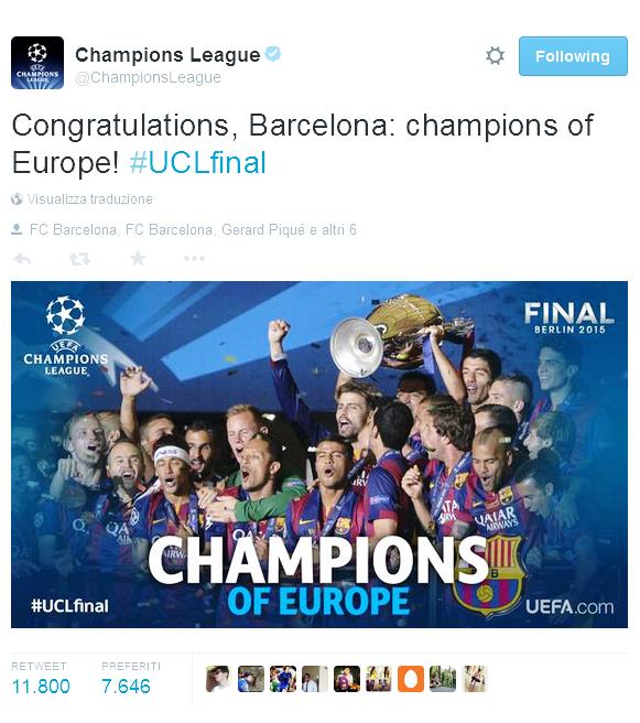 Come da pronostico ad alazare la coppa dalle grandi orecchie è stato il Barcellona di Luis Enrique, conuistando il triplete al suo primo anno, battendo una coraggiosa Juventus per 3-1, reti di Raketic, Morata, Suarez e Neymar.