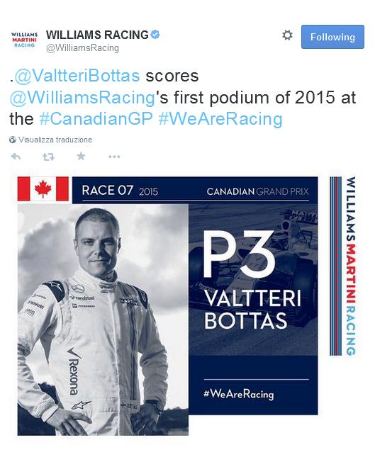Ancora una doppietta per la Mercedes, a Montreal Lewis Hamilton precede il compagno di squadra Nico Rosberg, in terza posizione il finlandese Valtteri Bottas, ha conquistato il primo podio della stagione, sia personale che per la Williams.