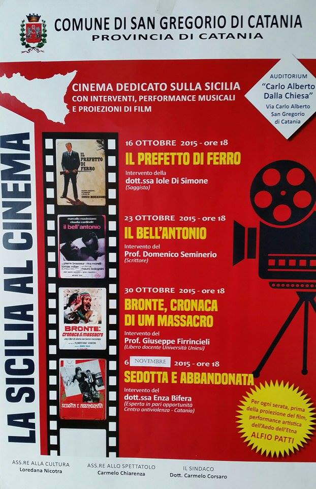 Il cinema come momento di riflessione su argomenti che caratterizzano la nostra Sicilia con tematiche che spaziano dal brigantaggio al sesso all’interno delle quali la Sicilia esprime tutto un mondo complesso e variegato. Ecco cosa racchiude la rassegna cinematografica dedicata alla Sicilia iniziata presso l’Auditorium “Carlo Alberto Dalla Chiesa” di San Gregorio di Catania, promossa dall’Associazione Culturale “Radiusu” e patrocinata dagli Assessorati alla Cultura e allo Spettacolo del Comune di San Gregorio.