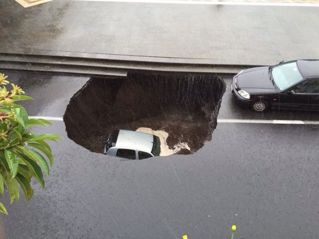 Una voragine nel corso principale di Valverde ha inghiottito un’automobile in sosta e solo adesso si scopre che tutta la piazza non è sicura a causa di infiltrazioni d’acqua.