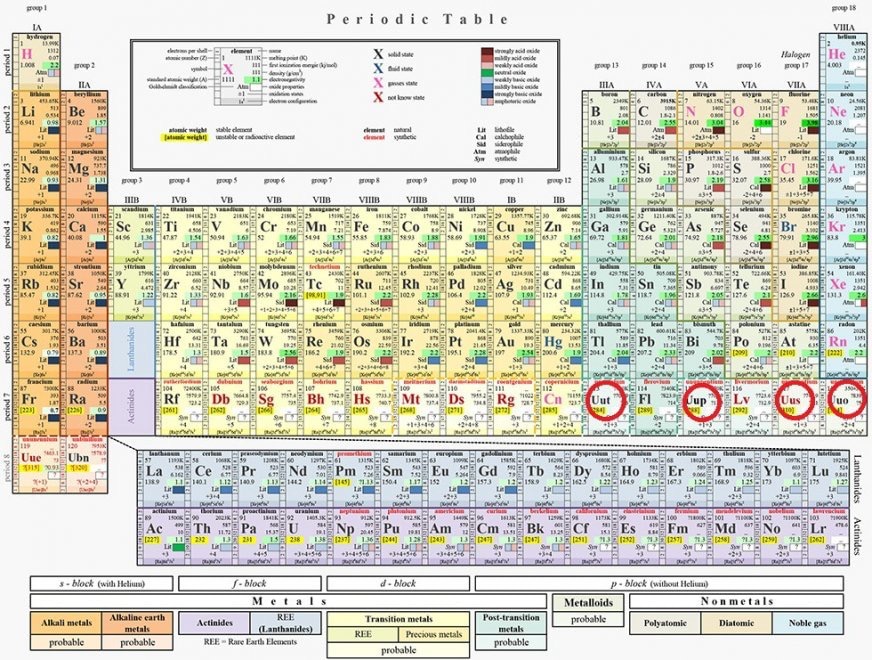 A completare definitivamente la settima riga della tavola periodica sono degli elementi ancora privi di nome, l’onere ed il piacere di affibbiare la denominazione spetta ai ricercatori protagonisti della scoperta, le regole da seguire sono semplici basta tener conto delle caratteristiche chimico-fisiche dell’elemento o proporre un luogo, una personalità scientifica o, ancora, qualcosa riconducibile alla mitologia. Fino a quel momento per tutti saranno riconosciuti come: ununtrio (Uut 113), ununpentio (Uup 115), ununseptio (Uus 117) e ununoctio (Uuo 118).