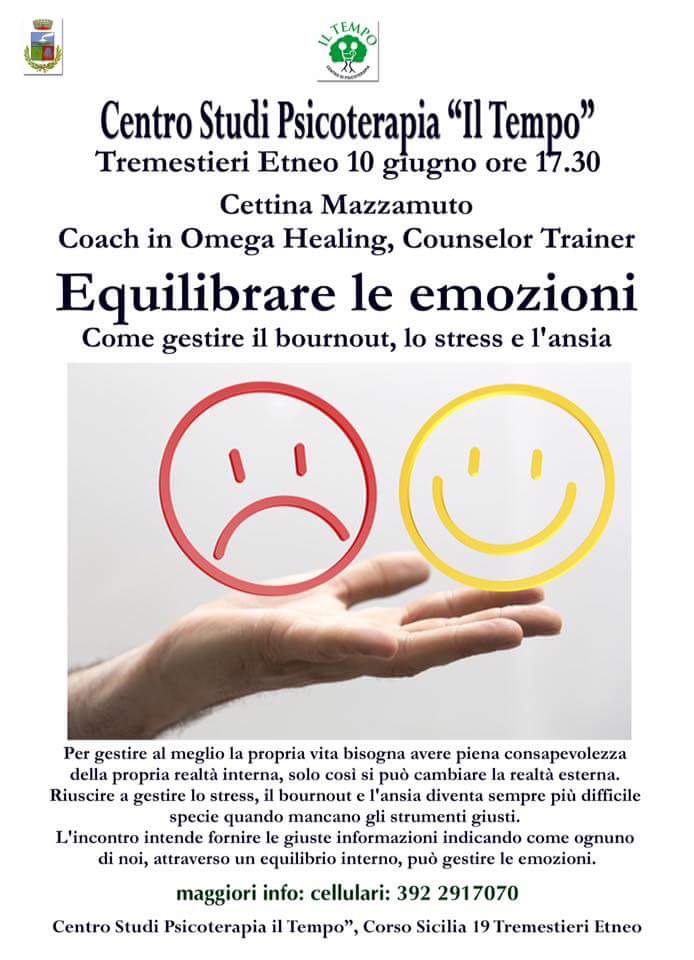 Venerdì 10 giugno 2016 alle ore 17:30, presso il Centro di Psicoterapia “Il Tempo”, Corso Sicilia 19 – Tremestieri Etneo, si è svolto il seminario formativo “Equilibrare le emozioni, come gestire il bournout, lo stress e l’ansia” tenuto dalla dottoressa Cettina Mazzamuto, coach in Omega Healing e Counselor Trainer.Per gestire al meglio la propria vita – afferma la dottoressa Cettina Mazzamuto, bisogna avere piena consapevolezza della propria realtà interna, solo così si può cambiare la realtà esterna. Riuscire a gestire lo stress, il bornout e l’ansia diventa sempre più difficile specie quando mancano gli strumenti giusti.