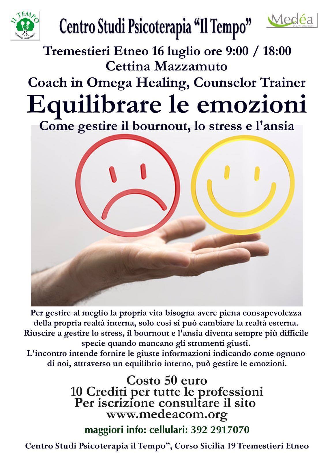 Sabato 16 luglio 2016 dalle ore 09:00 alle ore 18:00, presso il Centro di Psicoterapia “Il Tempo”, Corso Sicilia 19 – Tremestieri Etneo, dopo il grande successo del primo appuntamento, si svolgerà il secondo seminario formativo “Equilibrare le emozioni, come gestire il bournout, lo stress e l’ansia” tenuto dalla dottoressa Cettina Mazzamuto, coach in Omega Healing e Counselor Trainer.