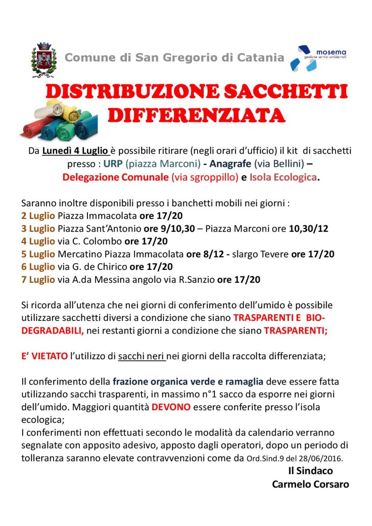 È stata emessa dal Sindaco di San Gregorio Carmelo Corsaro una nuova ordinanza sul sistema di raccolta differenziata, che regolamenta in modo efficace le modalità di conferimento dei rifiuti. Per far si che i cittadini rispettino l’ordinanza da lunedì 4 luglio verrà distribuito un kit di sacchetti a tutti i sangregoresi.