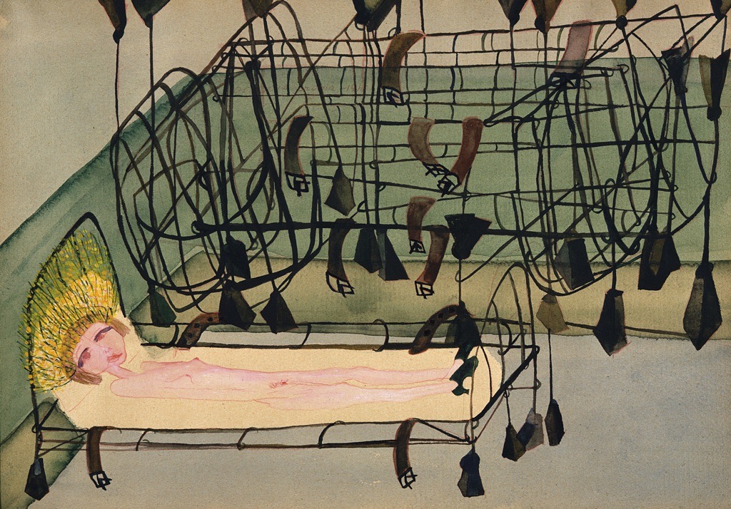 Siringhe, piccoli occhi vitrei che ci osservano dalla tela, unghie e componenti meccaniche, simboli matematici, camere d’aria e poi i disegni e acquerelli apertamente erotici, con corpi nudi e mutilati, organi genitali e lingue sfacciate.