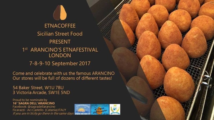 Per tutti gli amanti della cucina siciliana, arriva anche in Inghilterra la sagra più attesa di Settembre. Quest'anno, la sagra si sdoppia, raggiungendo Londra carica di gustosissimi arancini. I protagonisti di questo doppio evento sono i fratelli Bauso, scelti dall'associazione l'Isola che non c'è, per aver diffuso la tradizione e la cultura delle pietanze tipiche siciliane. La motivazione è certamente legata alla somiglianza dei sapori e del gusto della famosissima palla di riso, ma soprattutto alla genuinità dei prodotti utilizzati che arrivano direttamente dalla Sicilia. Etnacoffee è sinonimo di una vera esperienza alimentare siciliana sulle road di Londra. Questo passaggio di testimone, è stato accolto a braccia aperte dai fratelli Bauso, che per l'occasione hanno organizzato un evento di degustazione in entrambi i locali. Sarà possibile gustare oltre dieci varianti di arancini, cucinati secondo la tipica preparazione araba-siciliana. Oltre i classici al ragù, al burro e prosciutto, e agli spinaci, saranno preparati arancini alla norma (salsa di pomodoro, melanzane e ricotta salata) e il preziosissimo arancino con bacon e pistacchio di Bronte; per quest'ultimo, i fratelli Bauso hanno ottenuto la certificazione ufficiale del Sindaco di Bronte al fine di far conoscere l'oro verde oltre i confini siciliani.