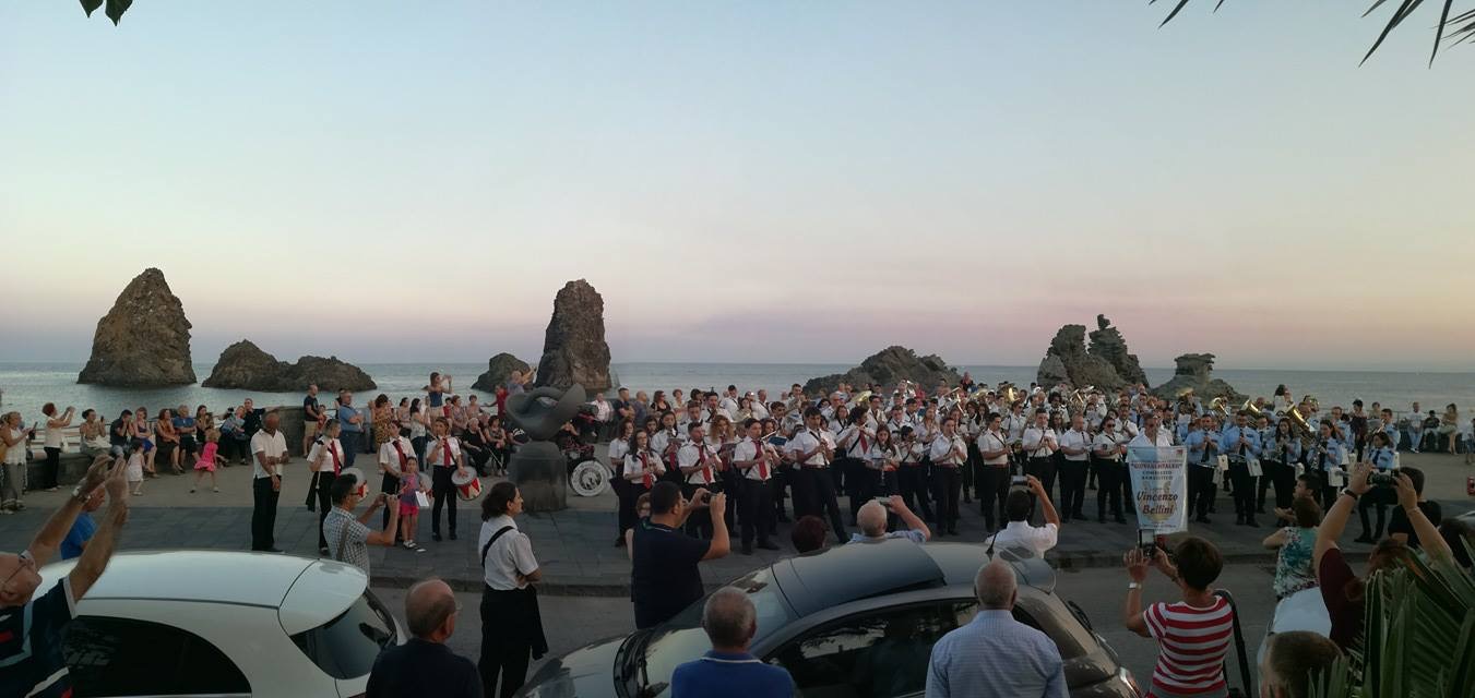 musicali autonome, sono state le bande “Vincenzo Bellini – Città di Tusa (ME)”, “Vincenzo Bellini – Città di San Salvatore di Fitalia (ME)”, “Santa Cecilia V. M. – Città di Sommatino (CL)” e “Amici della musica – Città di Nicolosi (CT)”, che hanno prima sfilato per le vie del paese, eseguendo insieme l’inno di Mameli nella suggestiva piazza del Lungomare dei Ciclopi, e poi si sono esibite in piazza Giovanni Verga di fronte ad un folto pubblico.