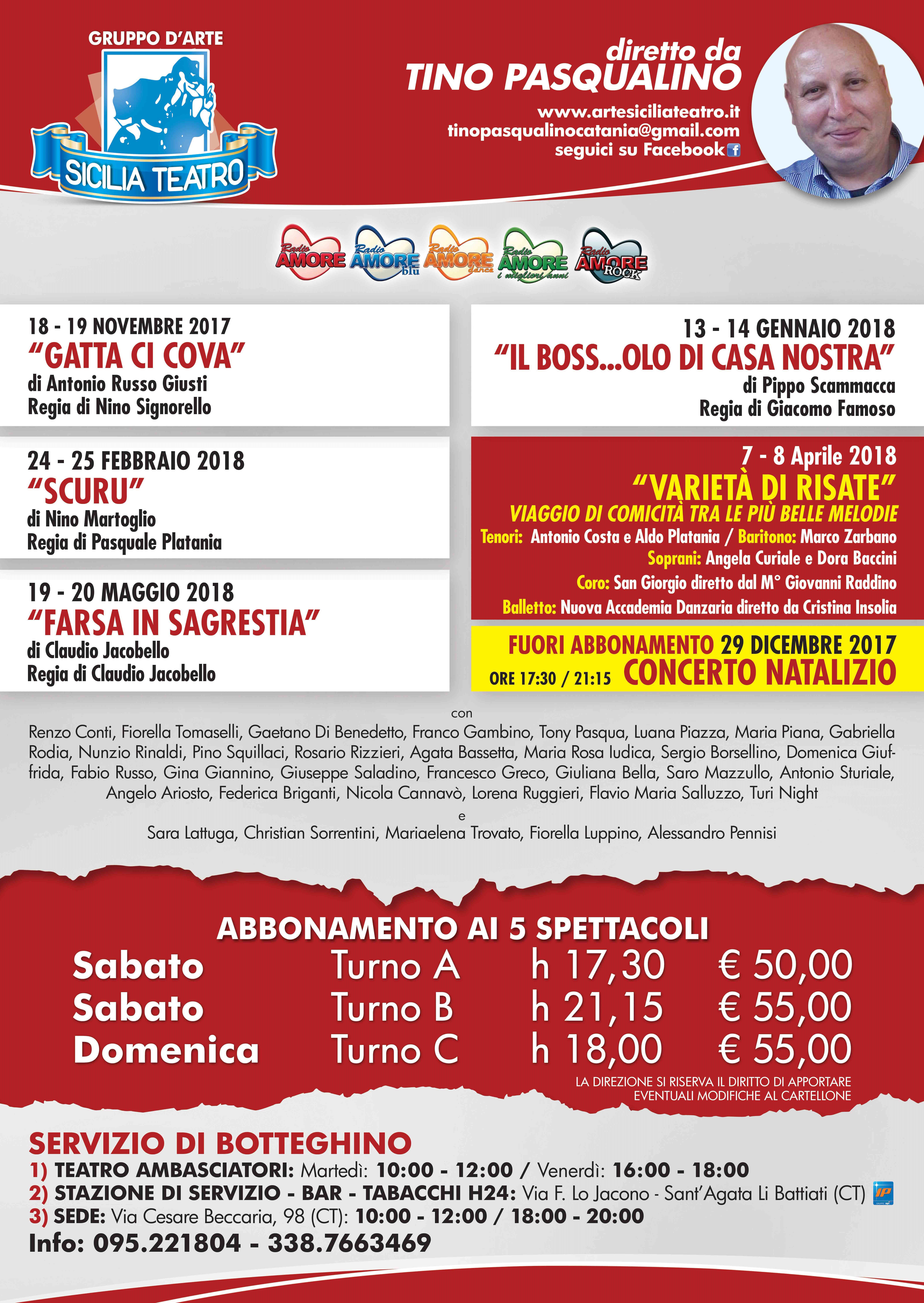Si parte, anche quest’anno al Teatro Ambasciatori , il 18/19 Novembre, con “Gatta ci cova”, 13 e14 Gennaio con “Il boss..olo di casa nostra” , 24/25 Febbraio “Scuru” di Nino Martoglio e “Varietà di risate”, chiude i il 19/20 Maggio “Farsa in Sagrestia”.