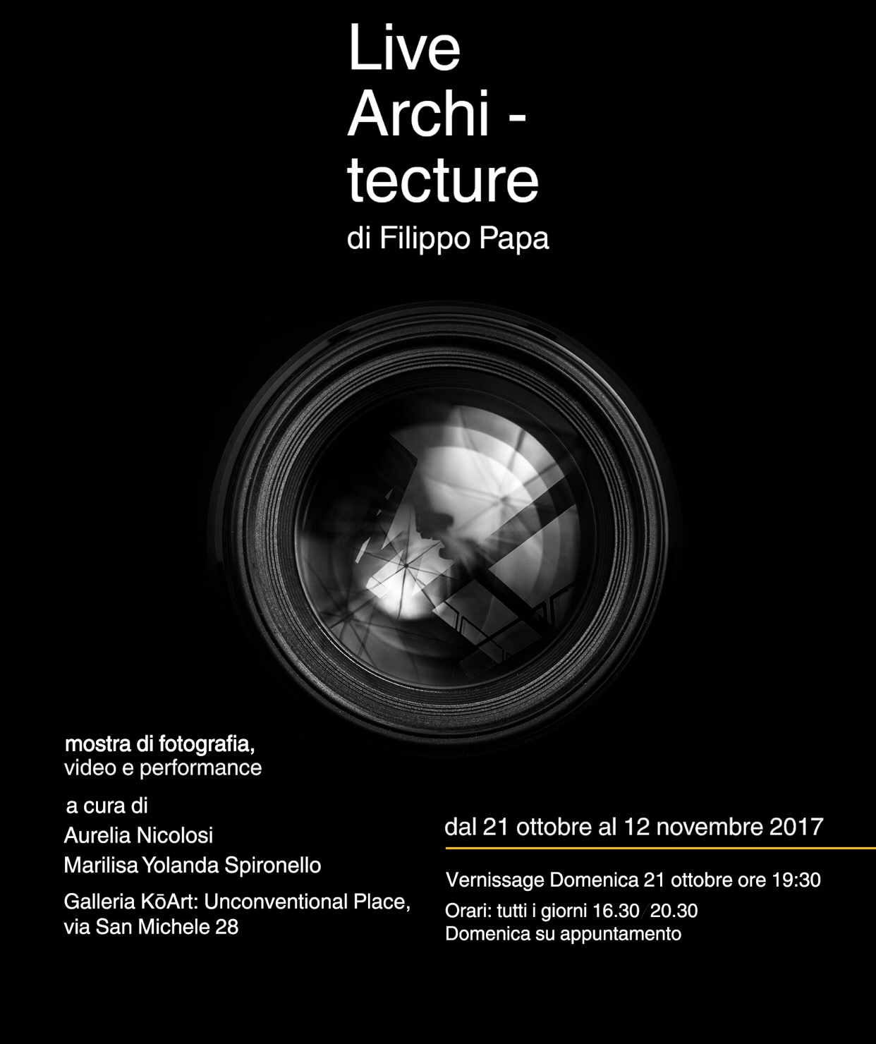 Live architecture nasce da una approfondita ricerca dell’architettura da parte dell’artista, che analizza le sue forme e la luce su di esse. Dopo la mostra personale di fotografia e video “Archai” fondata su questa ricerca, e del video “L’anima dei luoghi”, Papa cerca di andare oltre addentrandosi sempre di più a livello progettuale,nella ricerca tesa alle forme architettoniche soffermando la sua attenzione al fruitore delle sue opere. Da queste riflessioni prende vita il progetto video “Live architecture”. Un viaggio di un anno, in cui l’artista ha agito in un atto “performativo” filmando un’architettura a settimana collegandosi in “diretta” tramite il social network “Facebook” alla sua fan page. A fine anno tutti i video sono stati uniti in un unico montaggio, dando vita al video “Live Architecture 52” Live architecture è stato un progetto, un viaggio, un esperienza “live” dell’agire dell’artista documentata e condivisa sul web. Troviamo l’interazione con i social e la contaminazione di essi nell’arte contemporanea. Importante l’elemento della condivisione in diretta che enfatizza e amplifica l’esperienza di interazione del fruitore con l’opera. Il mondo web diventa strumento di condivisione, porta d’accesso verso l’essenza delle forme architettoniche che Papa vuole scrutare e analizzate in tempo reale. Il video finale, rappresenta il diario di viaggio, che diventa opera. L’artista dice: “Alzo gli occhi e guardo, le forme architettoniche, entrano dentro di me e si trasformano. Fermare, ma allo stesso tempo rendere dinamico quest’atto creativo tramite un video in diretta crea un fortissimo legame fra me, l’opera e il pubblico.” Live Architecture diventa una mostra di fotografia video e performance che verrà presentata all’interno della galleria d’arte Kōart: unconventional placea a cura della prof.ssa Aurelia Nicolosi e della prof. ssa Marilisa Yolanda Spironello La mostra prevede una video installazione che vedrà protagonista l’opera “Live Architecture 52” e 5 fotografie che provengono dalla mostra personale dell’artista “Archai”.