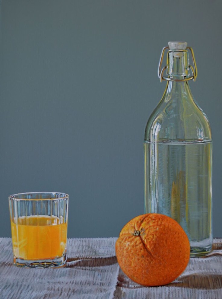 L’opera che più di altre attira la nostra attenzione è una tela ad olio, con una bottiglia d’acqua, un’arancia e un bicchiere. Lo so vi piace, questo quadro signori l’ho chiamato “Succo d’arancia”, ma Maestro, lo sa che le sue opere sembrano delle foto? La minuzia e la cura che mette in ogni dettaglio ci porta ad una visione realistica straordinaria, gli oggetti che lei raffigura, la frutta, le bottiglie, i bicchieri, parlano di lei e della sua essenza, del suo mondo percepito. Tutto, vi assicuro, è disegnato e dipinto a mano, ogni sfumatura di colore nei miei quadri, dice Pietro Alessandro, è attentamente studiata per creare la sensazione della luce reale che entra nell’ambiente.