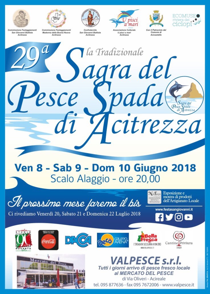 Appuntamento imperdibile ad Acitrezza giorno 8/9/10 giugno con la 29° Sagra del Pesce Spada che apre ufficialmente la stagione estiva di eventi e sagre del movimentato borgo marinaro.
