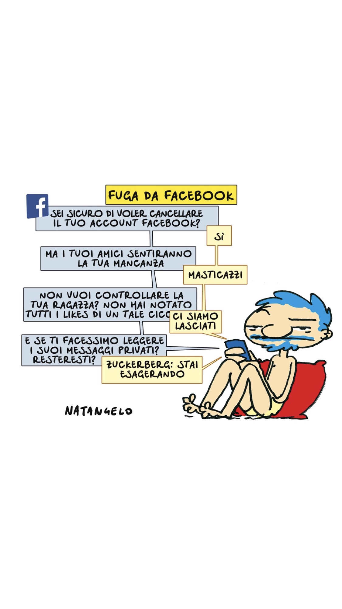 – Zia, ma proprio una persona così giovane e giovanile come te, cosa aspetti a cancellarti da Facebook! È per vecchi decrepiti! Tu non sei una vecchia!