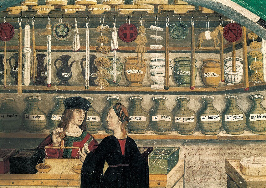 Infine gli Speziali dell’epoca vendevano anche lo zucchero, costosissimo e medicamentoso, esso si poteva comprare in varie forme e diversamente trattato, in pani, candito, raffinato, rosato, violato, in polvere. La prima codificazione scritta di tutte queste spezie orientali, in Italia, pensate, compare nei libri di cucina del XIV secolo.