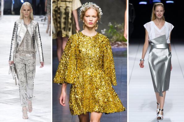 L’argento è un colore sfavillante e siderale che ben si adatta a bionde e more. Se accostato ad altri colori diventa meno lunare, come mostra Karl Lagerfeld per Chanel che mette lo spolverino argentato sulla minigonna nera. Armani abbina l’argento di tessuti eterei al tenero rosa opaco e mat, mentre Maria Grazia Chiuri per Christian Dior utilizza tessuti argentati cangiati nelle sfumature del rosa pallido. Argento + oro, uguale platino, come insegna Alberta Ferretti con il suo look laminato scintillante come una stella di Natale.